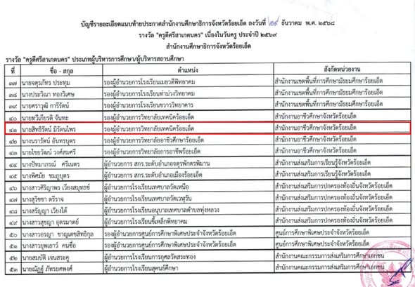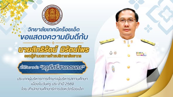 วิทยาลัยเทคนิคร้อยเอ็ด ขอแสดงความยินดี 6 มกราคม 25696 มกราคม 2026ธานินท์ อาระหังข่าวประชาสัมพันธ์, รางวัลที่ได้รับ วิทยาลัยเทคนิคร้อยเอ็ด ขอแสดงความยินดีกับ นายสิทธิรัตน์ มิรัตนไพร รองผู้อำนวยการฝ่ายบริหารทรัพยากร ได้รับรางวัล “ครูดีศรีสาเกตนคร” ประเภทผู้บริหารการศึกษา/ผู้บริหารสถานศึกษา เนื่องในวันครู ประจำปี 2569 โดย สำนักงานศึกษาธิการจังหวัดร้อยเอ็ด Post Views: 68